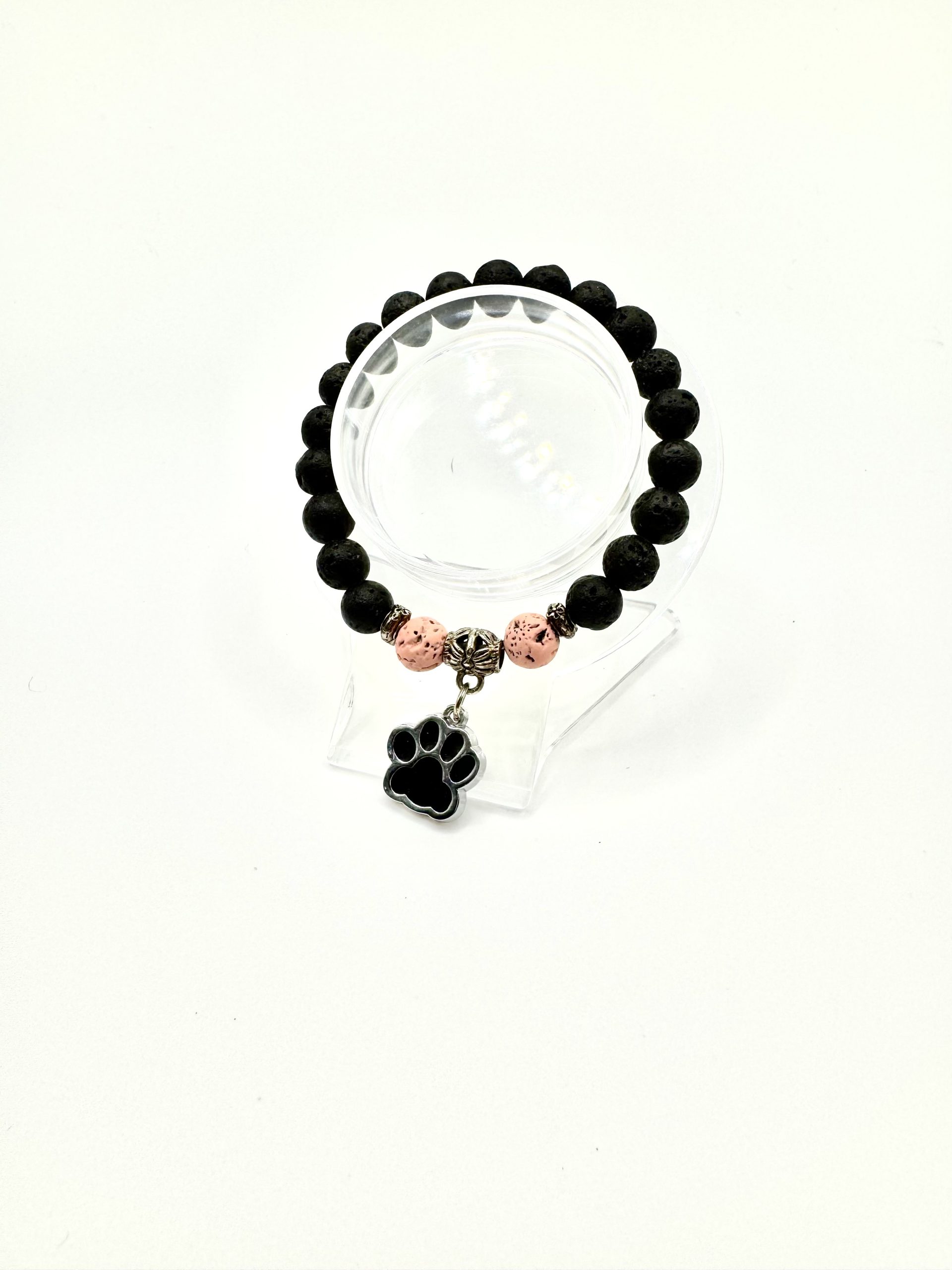8mm Black Lava Stone Beaded Bracelet with 2 Pink Lava Stone Beads and a Black Paw Charm