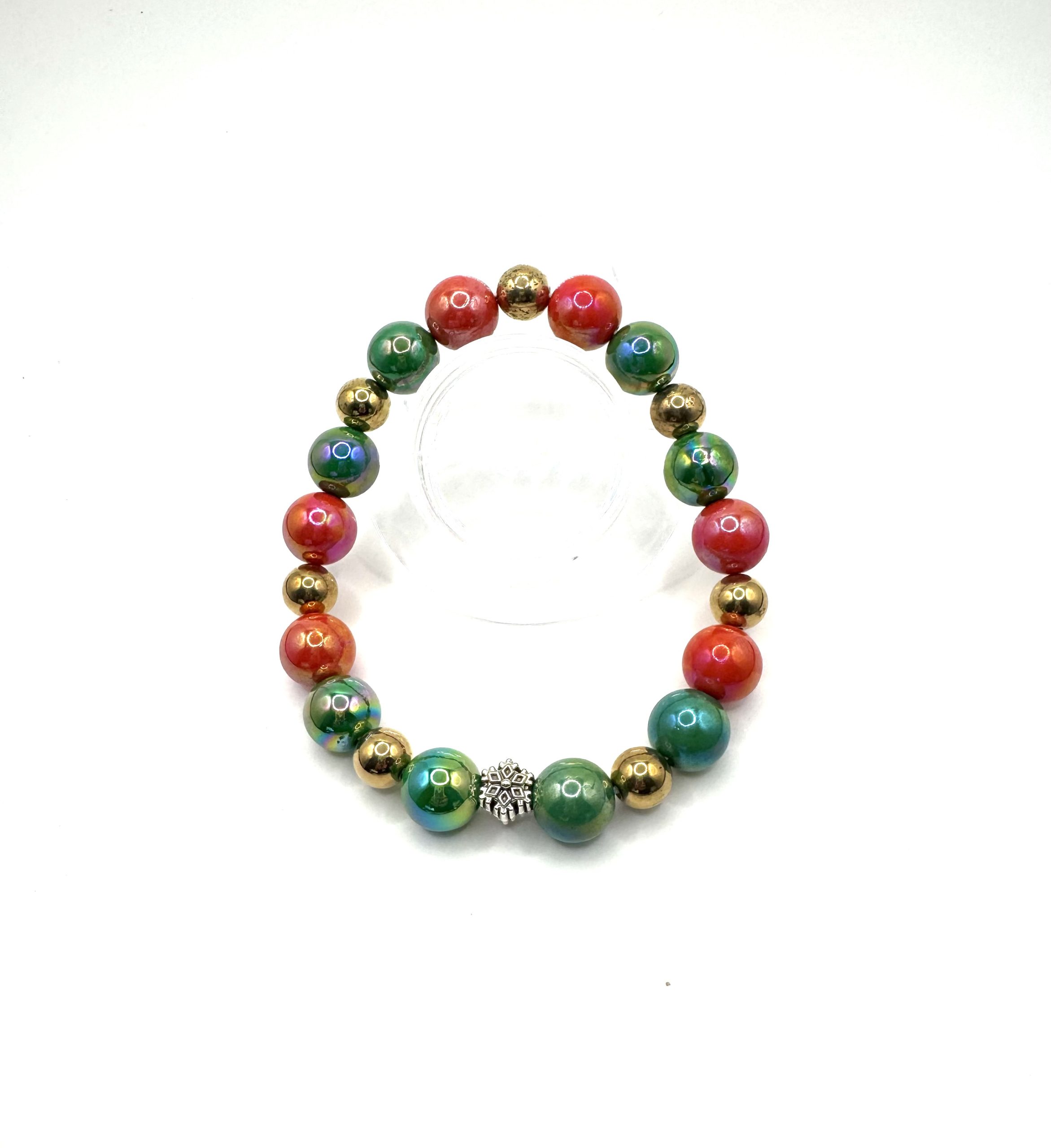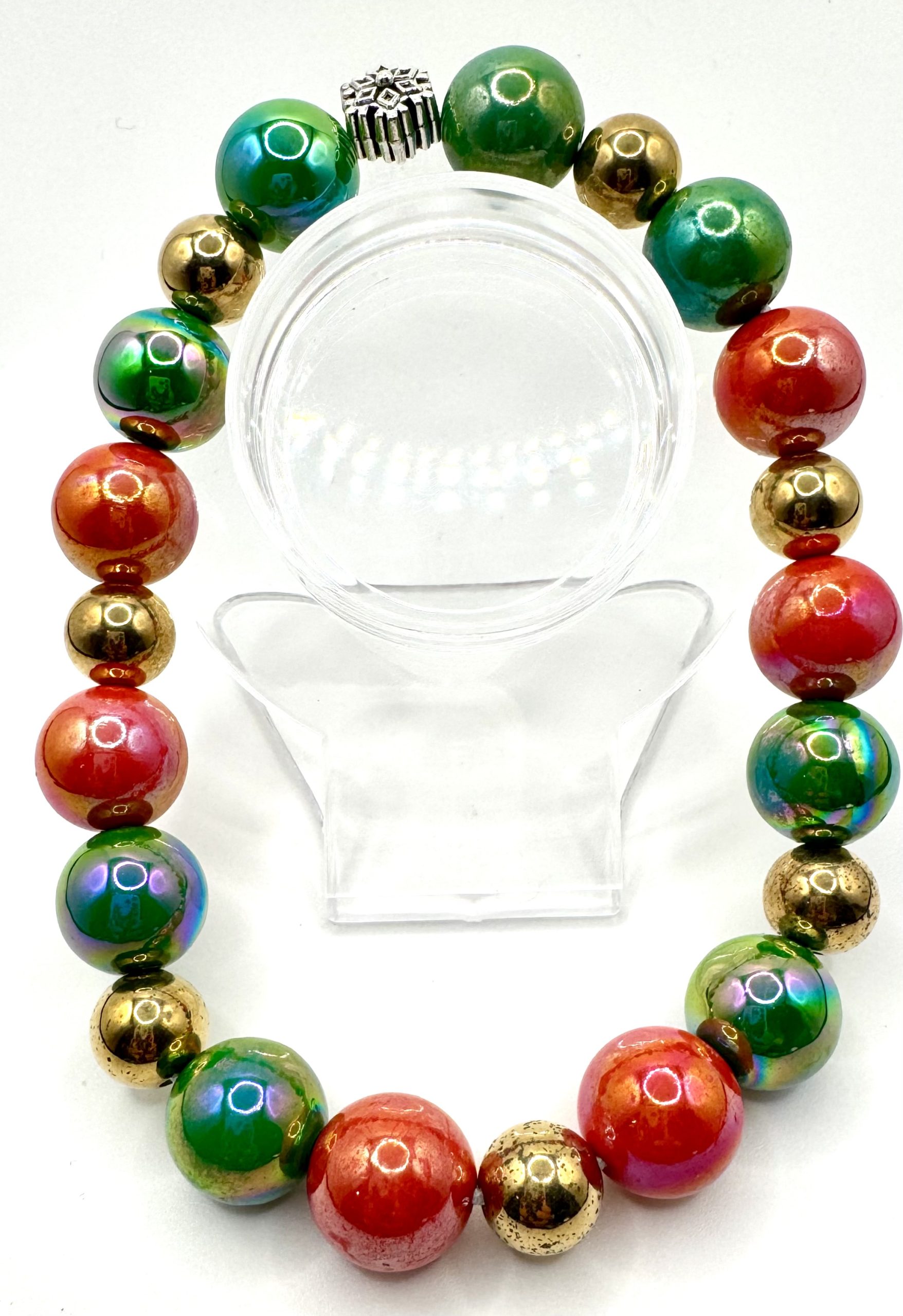 Dog Necklace with Iridescent Green and Red Beads with Gold Tone Spacers
