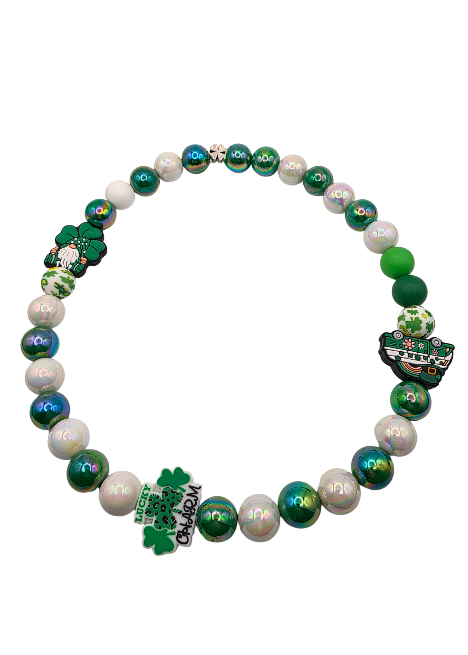 Assorted green and white beads with festive accents make the perfect St. Paddy’s Day dog necklace.