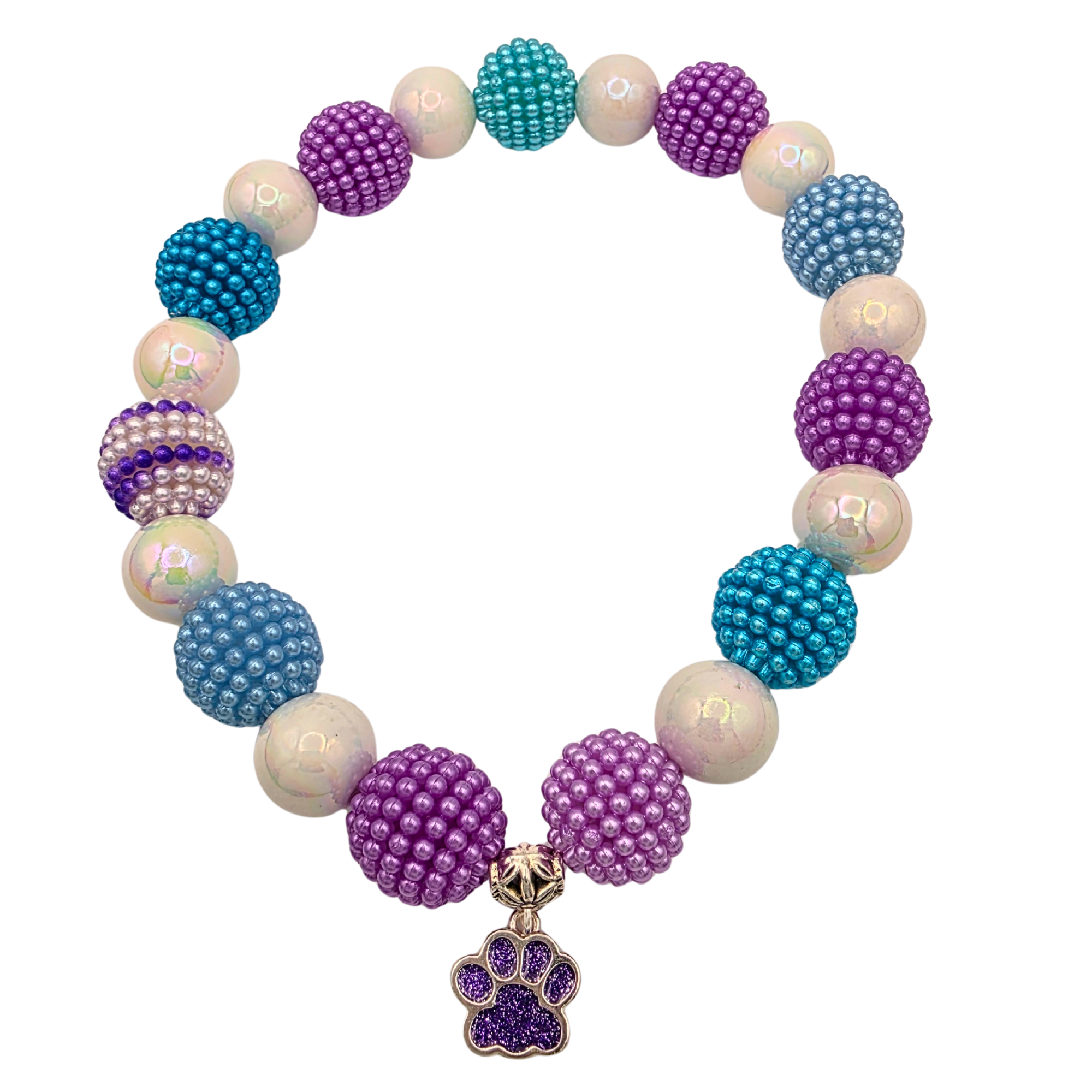 Part of our new Spring Collection. This Dog Necklace has purple, teal, and light blue beads. A purple glitter paw charm completes the necklace.